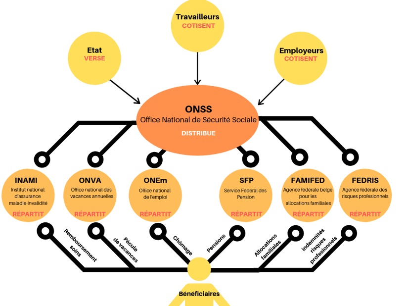 L’ensemble de ces contributions est mis dans un pot commun : l’ONSS (Office National de sécurité sociale). Cet organisme central est chargé de la perception, de la gestion et de la répartition de tout cet argent. Le budget de la sécurité sociale s’élève à plus ou moins 121 milliards d’euros par an. Celui-ci vient donc des travailleuses/eurs, des employeuses/eurs et de l’État fédéral [1]. Il est ensuite redistribué entre différents organismes qui couvrent chacun différents « risques de la vie » : la maladie et l’invalidité (INAMI – Institut National d’Assurance Maladie-Invalidité), le chômage (ONEM – Office National de l’Emploi), les vacances annuelles (ONVA – Office National des Vacances Annuelles), la pension (SFP – Service Fédéral des Pensions), les risques professionnels (FEDRIS – Agence Fédérale des risques professionnels), et dans une moindre mesure, les allocations familiales (dont s’occupent maintenant les régions depuis la 6e réforme de l’État). Ces différents organismes se chargent alors de redistribuer l’argent à celles et ceux qui en ont besoin, et notamment, selon les chiffres de la FGTB en 2017 :