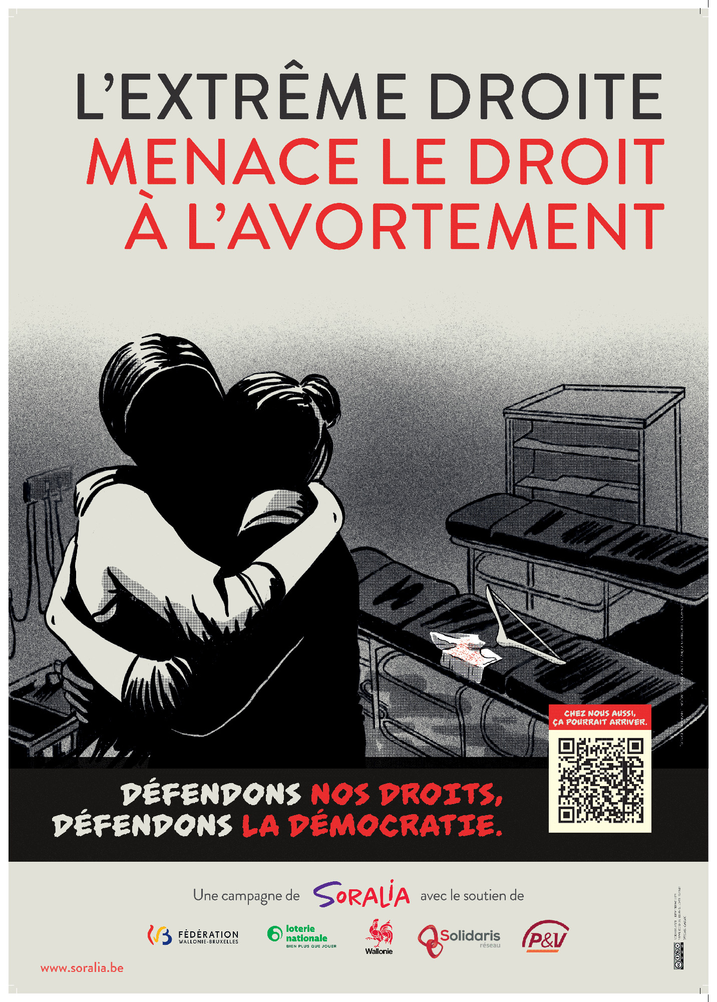 Au travers d’une bande dessinée fictionnelle, notre campagne illustre les dérives provoquées par des régimes totalitaires : restriction du droit à l’IVG, de l’accès aux soins de santé, de l’accès au chômage, des droits d’expression et de manifestation.
