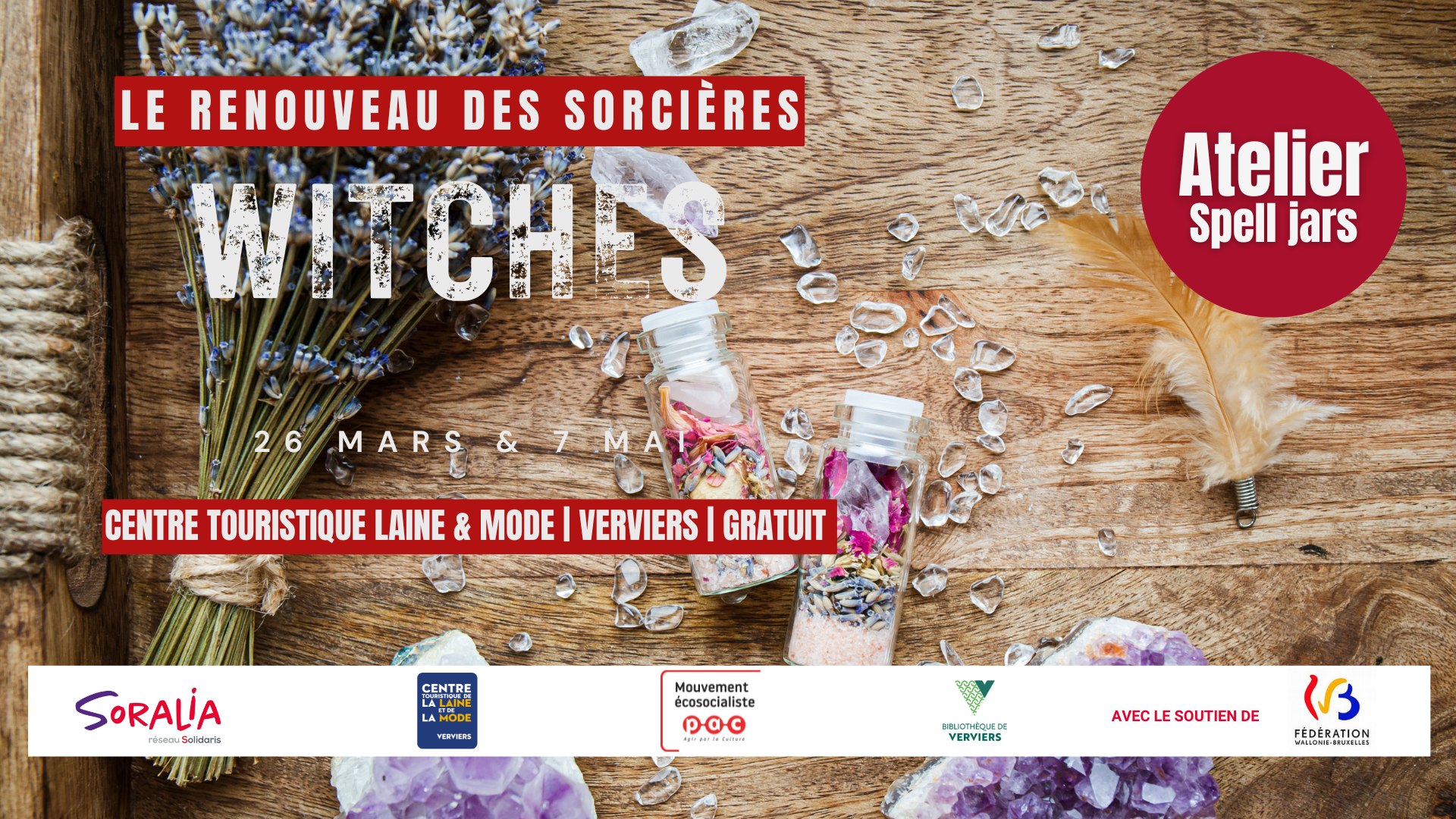 Ces ateliers sont organisés dans le cadre de l’exposition Witches réalisée en partenariat avec 𝑃𝐴𝐶 𝑉𝑒𝑟𝑣𝑖𝑒𝑟𝑠, 𝑙𝑒 𝐶𝑇𝐿𝑀, 𝑆𝑜𝑟𝑎𝑙𝑖𝑎 & 𝑙𝑎 𝐵𝑖𝑏𝑙𝑖𝑜𝑡ℎ𝑒̀𝑞𝑢𝑒 𝑑𝑒 𝑉𝑒𝑟𝑣𝑖𝑒𝑟𝑠.