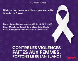 A l’occasion de la Journée Internationale de lutte contre toutes les formes de violences faites aux femmes, le Comité SORALIA Forest se rassemblera le samedi 25 novembre de 10h30 à 12h30 au marché de Forest pour une distribution de rubans blancs.