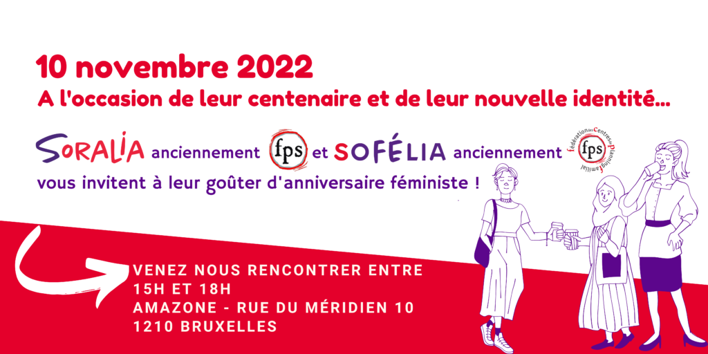 2022 est une année ponctuée de festivités et de changements pour notre Mouvement. D’une part, nous fêtons notre centenaire et, d’autre part, nous changeons d’identité en devenant Soralia. Afin de découvrir notre exposition retraçant notre historique ainsi que d’en savoir plus sur notre nouveau nom et sa signification, nous vous invitons le 10 novembre entre 15h et 18h pour un goûter d’anniversaire féministe à Amazone (rue du Méridien 10 1210 Bruxelles). L’équipe du secrétariat général de Soralia sera présente aux côtés de la Fédération des Centres de Planning familial des FPS qui change également de nom pour devenir Sofélia – La Fédé militante des Centres de Planning familial solidaires. L’équipe de Sofélia vous présentera aussi sa nouvelle identité visuelle et vous proposera un retour historique sur les dates clés qui ont ponctué l’existence de ses 17 Centres de Planning familial et autres points de contact affiliés.