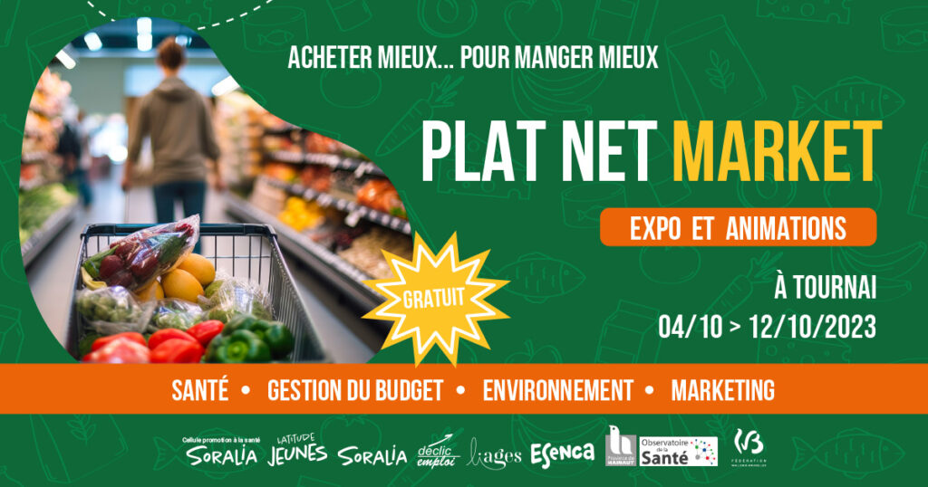 L’exposition Plat Net Market, réalisée par l’Observatoire de la Santé du Hainaut, se présente sous la forme d’un supermarché. Elle propose aux visiteurs de s’interroger sur leurs habitudes alimentaires, de trouver des pistes pour penser à leur santé, leur portefeuille et notre planète. En plus de la visite de l’expo, nous proposons des animations autour du thème de l’alimentation et la consommation.